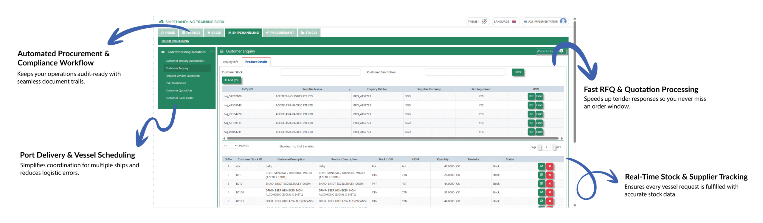 Singapore’s bustling port handles over 130,000 vessels annually, posing serious challenges for ship chandlers. The combination of tight timelines, overwhelming RFQ volumes, and manual processes often leads to inefficiencies. Our ship chandling ERP offers a unified solution tailored to these fast-paced operations.